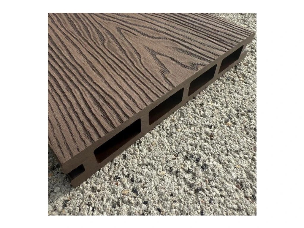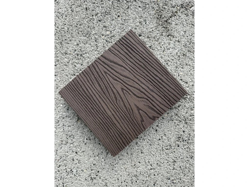 HPC terasové prkno čokoládové barvy s kresbou dřeva. Šířka prkna 160 mm, tloušťka 25 mm.