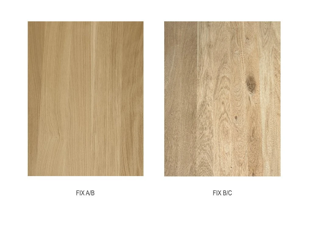 Strana B je hezká, s přiznanými zdravými suky a přirozenou kresbou dřeva. Strana C naopak může obsahovat větší, tmelené suky, barevné odlišnosti a další opravované vady, které ale neovlivňují pevnost desky.