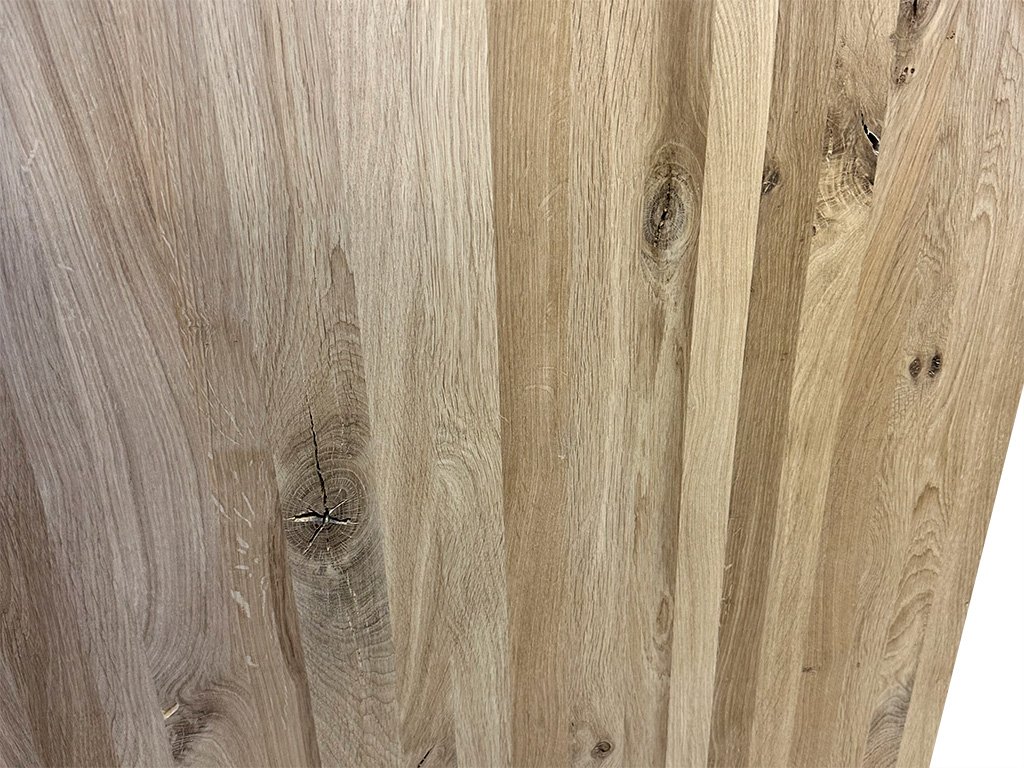 - Vzhled: Díky tomu je výsledná deska vizuálně jednotná, s minimem barevných rozdílů a plynulou kresbou dřeva. Je prakticky k nerozeznání od desky vyřezané z jednoho kusu masivu.