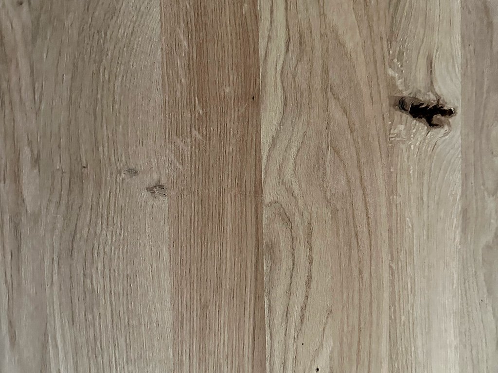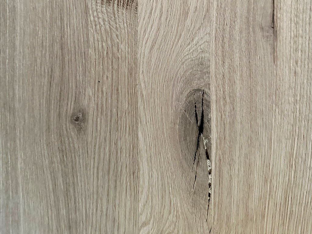 Na desce se vyskytuje velké množství suků a prasklin, které jsou přiznanou součástí designu. Důležité je, že všechny tyto přirozené znaky jsou profesionálně vyplněny speciálním černým tmelem, což vytváří jedinečný kontrast mezi dřevem a tmavými liniemi a zároveň hladký, plně funkční povrch.