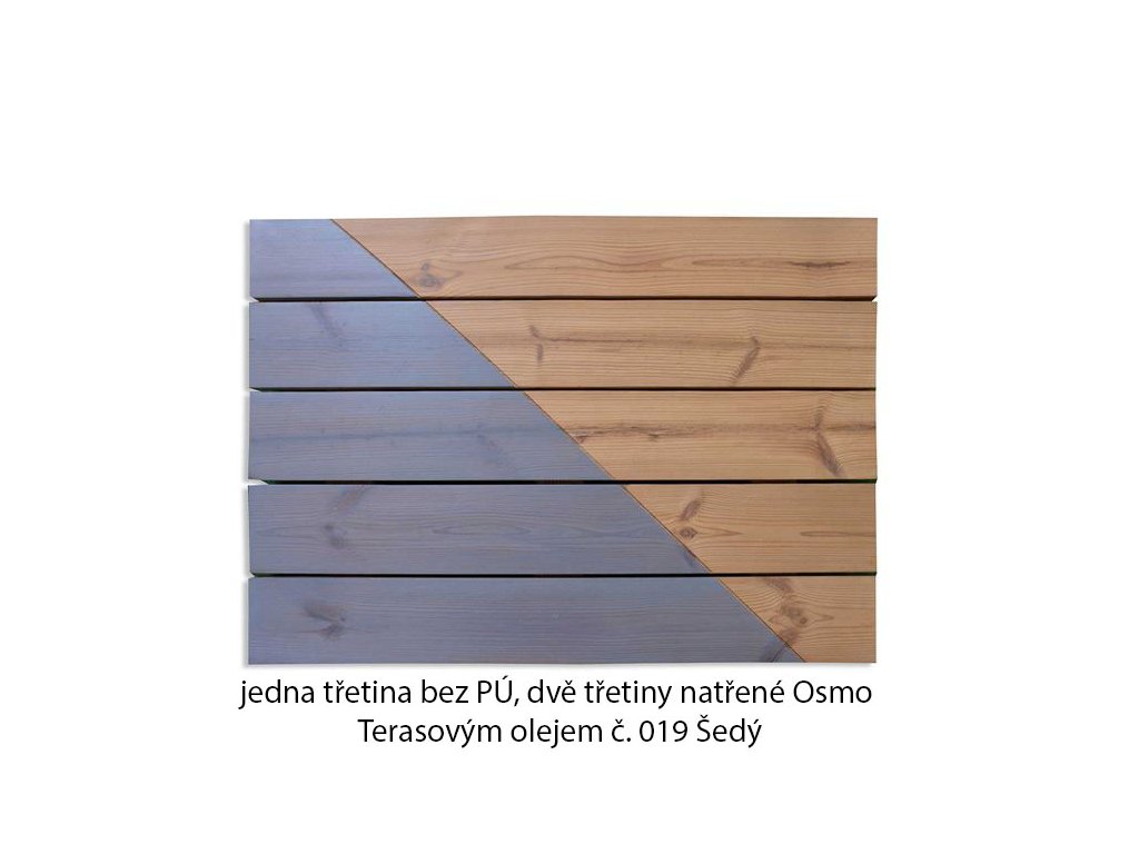 Pro zachování krásného tmavého odstínu a pro ochranu před UV zářením, které způsobuje šednutí, je nezbytné palubky co nejdříve ošetřit. Doporučujeme Osmo Terasový olej č. 010 Thermo dřevo, který zvýrazní původní barvu a poskytne efektivní UV ochranu. Počítejte s tím, že thermo dřevo je více nasákavé a spotřeba nátěru může být mírně vyšší.