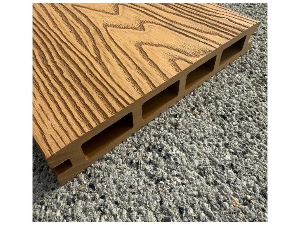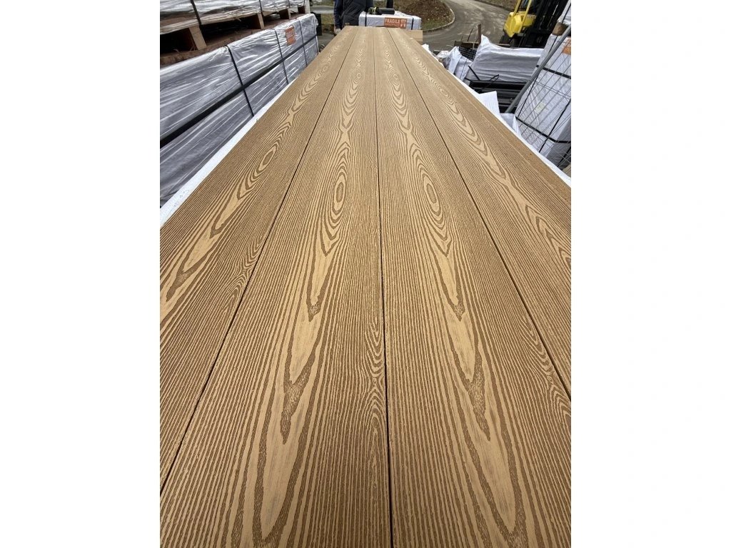 HPC terasové prkno barvy zlatého teaku s kresbou dřeva. Šířka prkna 160 mm, tloušťka 25 mm.